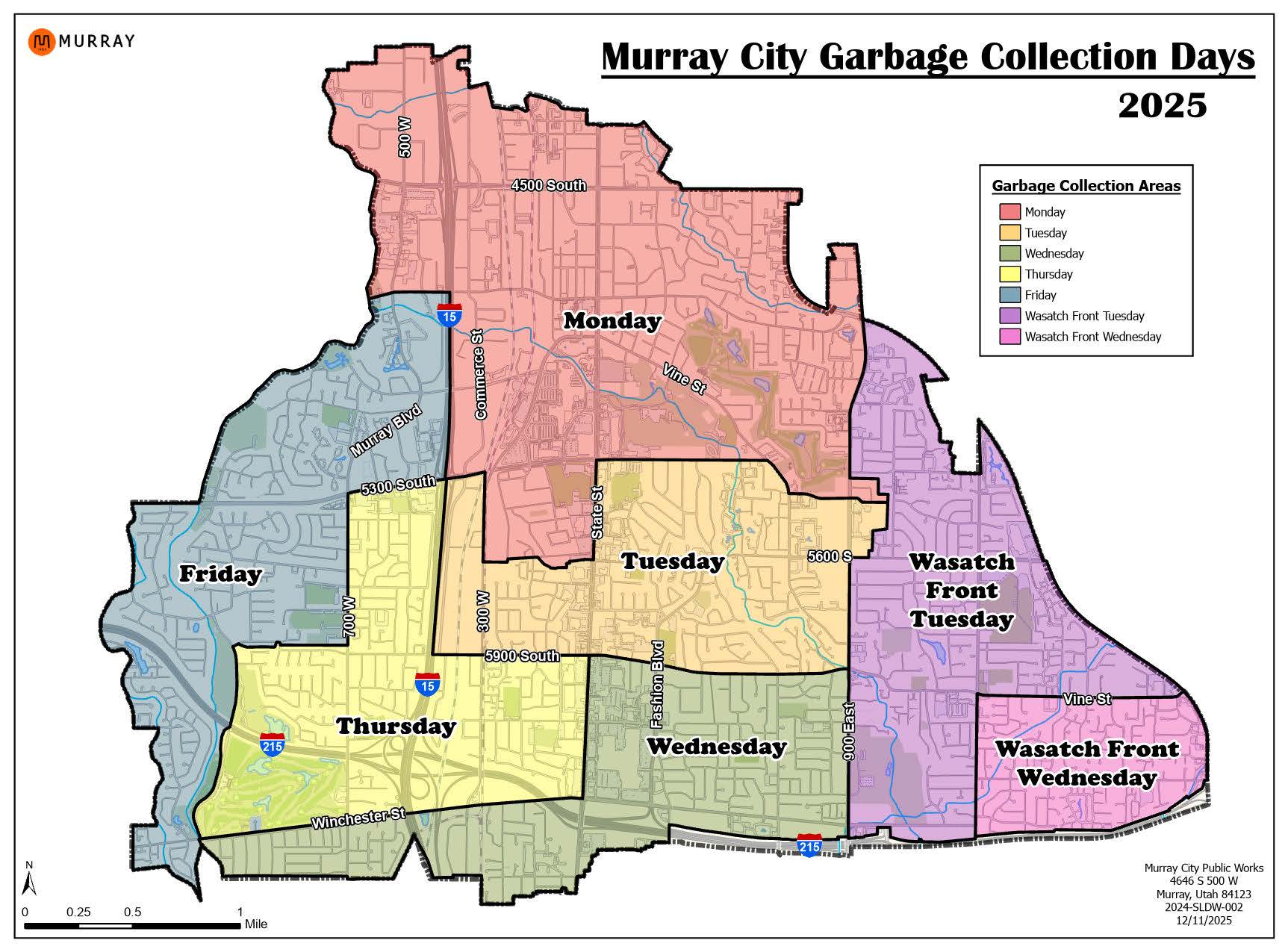 The City contracts with Ace Disposal to pick up and dispose of solid waste for most of the City. Some areas are served by Wasatch Front Waste & Recycling District. Please see the service area map/collection day schedule below.