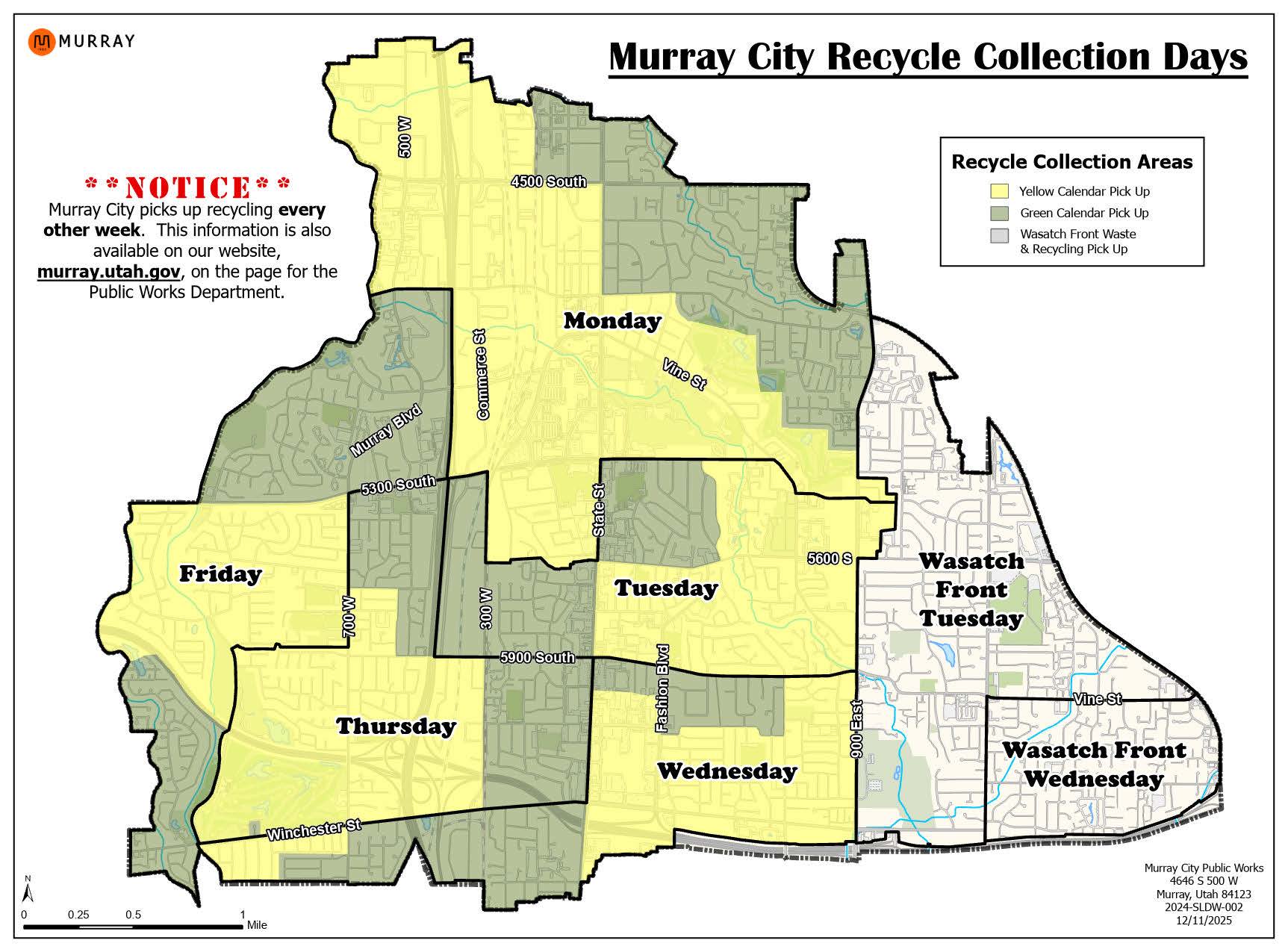 Murray City residents with Ace Disposal as their garbage service provider recycling days with co-inside with their assigned garbage day. The recycling schedule will alternate biweekly depending on where you are located within Murray City.